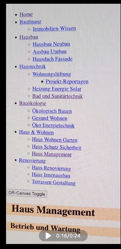2. Nur Firefox zeigt noch kurz die Linkliste (eigentlich das Off-Canvas-Menü vollständig) an und auch das dopplete BauPraxis-Logo im Kopf plus unter der Liste den Button "Off-Canvas-Toggle"